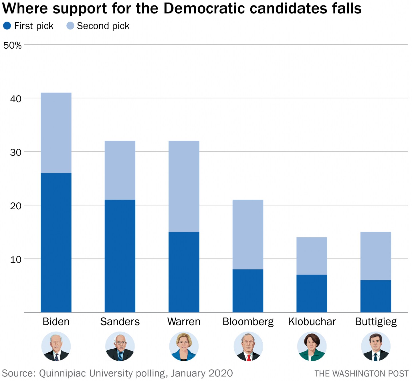 On Tuesday, we got new data from Quinnipiac University looking at this question on a national level. In Quinnipiac’s poll, former vice president Joe Biden is the top choice of Democratic primary voters, followed by Sens. Bernie Sanders (I-Vt.) and Elizabeth Warren (D-Mass.). But Warren is the top second choice of respondents. Combine first and second picks, and Warren matches Sanders in support.