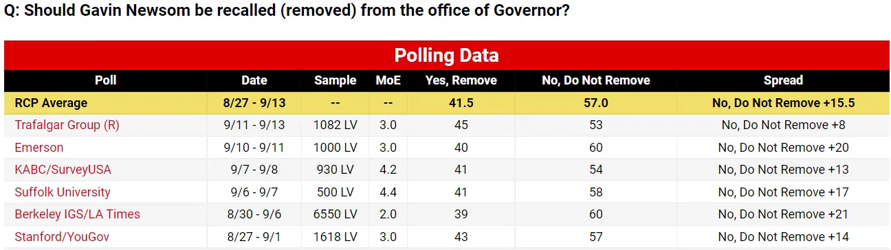 Just a few months ago, the vote looked iffy for Newsom, with many polls showing his chance of reaching the 50% threshold to retain the governorship in doubt. However, recent polling indicates a double-digit lead, in some instances, for the “No, Do Not Remove” option to keep Newsom as Governor.