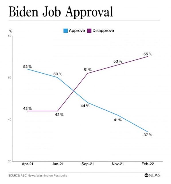 The poll, from ABC News and The Washington Post, found that 37 percent of adults in the U.S. strongly or somewhat approve of the way Biden is handling his job as president, compared to 55 percent who said they strongly or somewhat disapprove. Seven percent said they had no opinion.